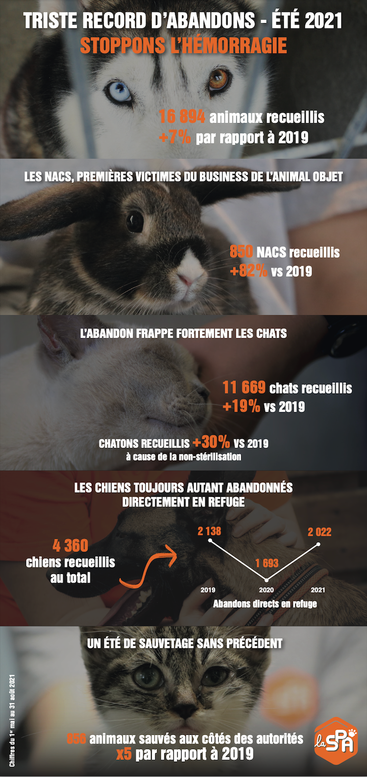 Entre le 1er mai et le 31 août 2021, 16 894 animaux ont été recueillis dans les refuges de la SPA (Société Protectrice des Animaux). Un nombre historiquement à son plus haut niveau pour une période estivale, soit une augmentation de 7 % par rapport au dernier « record » de 2019.