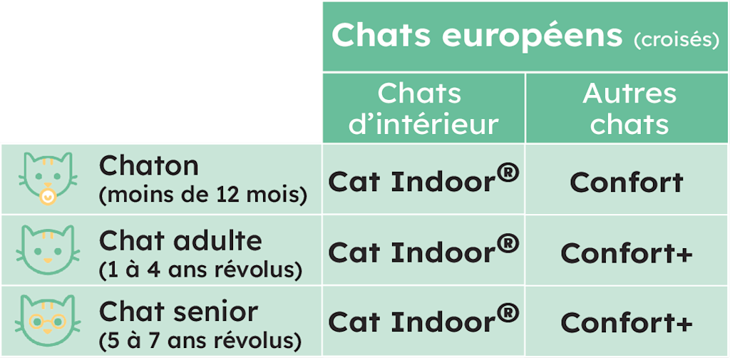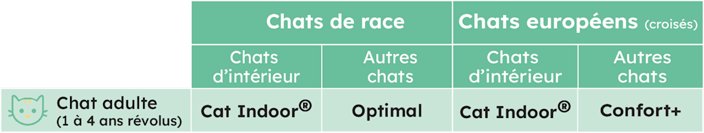 Voici un récapitulatif des formules recommandées, selon le type de chat (race ou européen), son âge et enfin si c’est un chat d’intérieur ou d’extérieur :