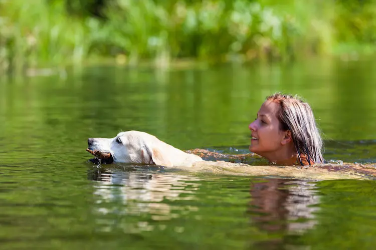 Une fois les premières étapes passées avec succès, vous pourrez envisager de nager avec votre chien plus loin, dans des eaux plus profondes. Mettez-vous à son niveau dans l’eau en nageant aux côtés de votre chien tout en le félicitant et l’encourageant chaudement. Il ne faut pas être avare de compliments tout au long de l’apprentissage de la nage à votre chien.
