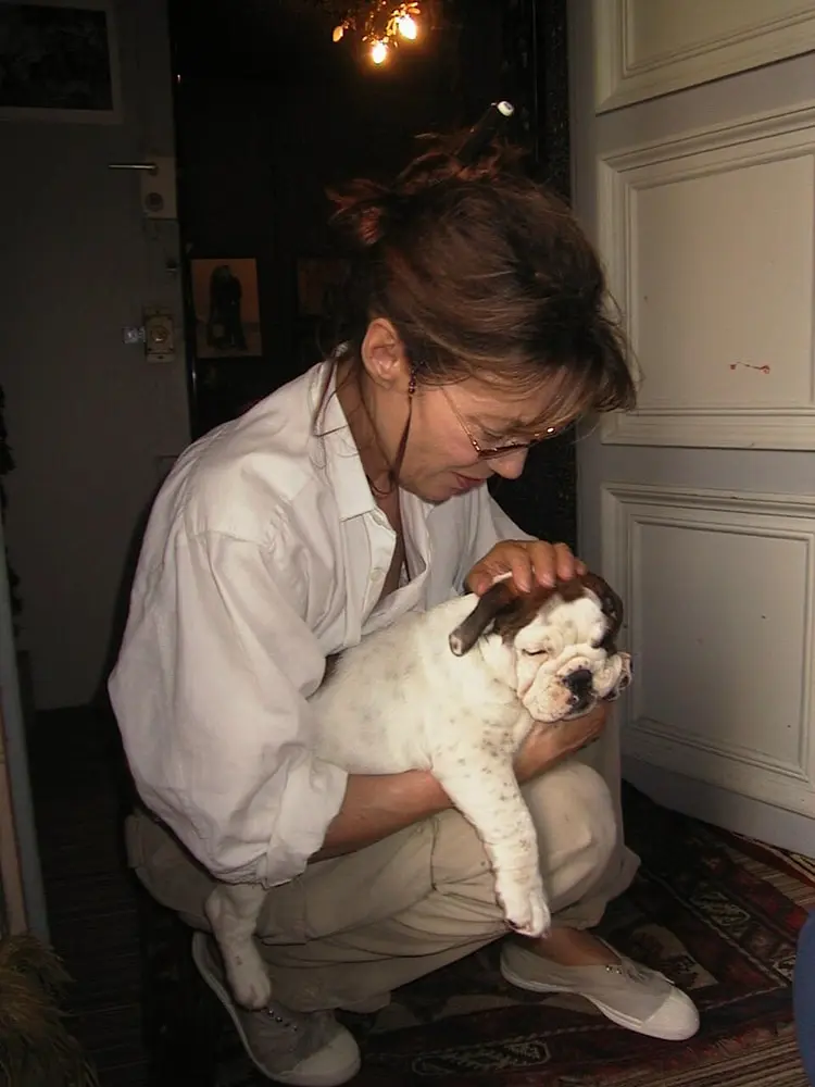 Elle avoue encore que souvent, dans son lit à baldaquin, elle dort « avec mes quatre petits-enfants et Dora, mon bulldog ». Cette race évoque pour elle le « croisement entre les lamantins et les hippopotames et [fait] rire les enfants ». Ensuite, ce sera au tour de Betty, puis Dolly, femelle bulldog anglais (affixe de la Tatumière) de le rejoindre à ses côtés.
