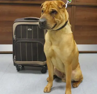 A ses côtés, un bol d’eau ainsi qu’une valise. A l’intérieur une couverture, un coussin, un jouet, et de la nourriture pour chien.