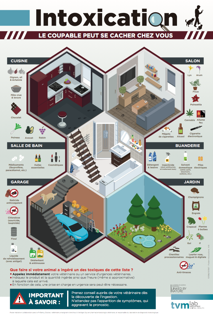 Intoxications chez le chien, le chat et petits animaux domestiques : les risques sont partout. Aussi bien à l’intérieur (cuisine, salon, salle de bain), dans les annexes (garage, buanderie) qu’à l’extérieur, au jardin. Il ne faut pas les sous-estimer. Le laboratoire vétérinaire TVM, qui s’investit entre autres dans la prise en charge des intoxications, a édité un petit fascicule très pratique et très bien documenté. Il est disponible chez votre vétérinaire et se décline également sous la forme d’un poster que vous pourrez consulter en salle d’attente. Un document précieux à avoir toujours sous la main et que vous pouvez télécharger !