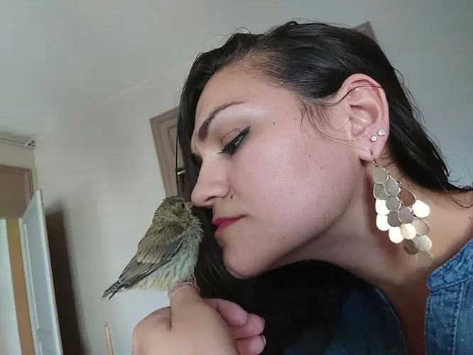 Techniquement, je me suis servie d’un couteau à beurre pour pouvoir le nourrir sans le blesser. Pour l’hydrater, je laissais des gouttes d’eau couler de mon doigt jusqu’à l’intérieur de son bec. C'était le meilleur moyen. Puis comme il grandissait, j’ai changé son alimentation afin qu’elle soit plus variée.