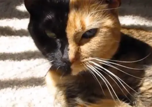 Agée de 3 ans, la chatte Vénus a la particularité d’avoir… 2 visages. Ou du moins 2 couleurs de poil au niveau de la face et réparties de façon parfaitement symétrique.